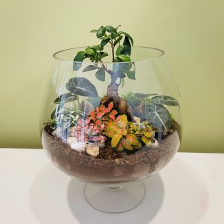 This living terrarium features a tropical look within a large fishbowl glass container.